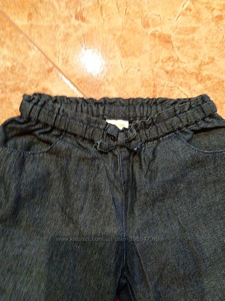 Джинси- капрі Gymboree 3T(можна носити від 2років).Із тонкого джинса,літом не жарко,декоровані ґудзиками на калошах, на задніх карманах красиві бантики.Талія на резинці,добре тягнеться.В ідеальному стані,одягали пару раз,швидко переросли і було багато іншого одягу.
