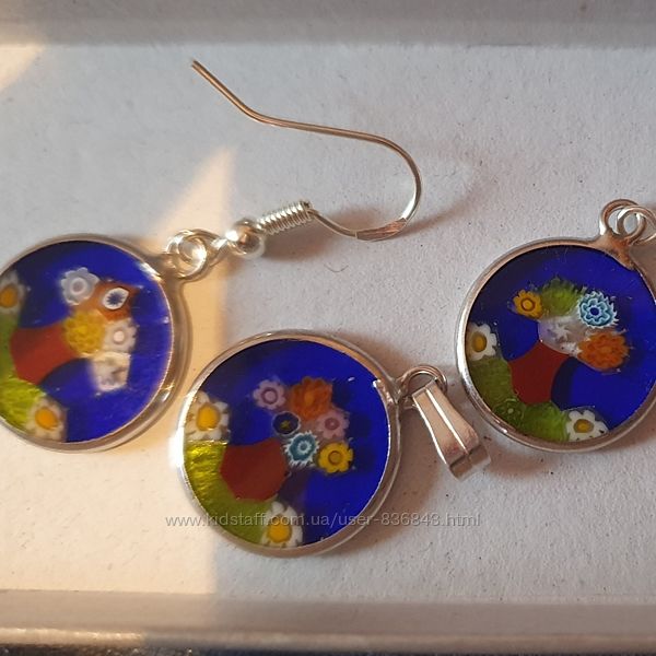 1. Винтажный набор мурано, редкая мозаика. Оправа - серебро 925. Не сравнивайте, пожалуйста, с современными изделиями :-)2.Красивый набор мурано с рисунком "дерево жизни" из муранского стекла. Окантовка и швензы - серебро. 925 пробы. Смотрится изящно. По размеру кулоны приблизительно как монетки в 1 коп.
