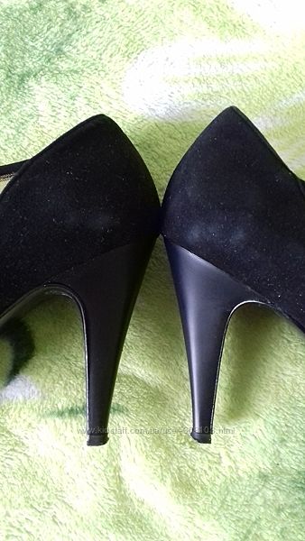 Материал - натуральная замша, носок -лакированный, есть вставки из пропитанной сетки. На шнуровке.