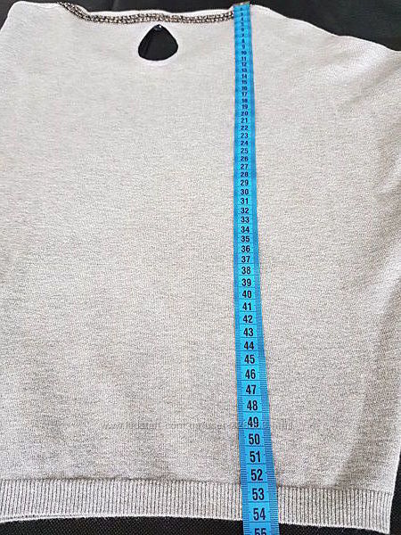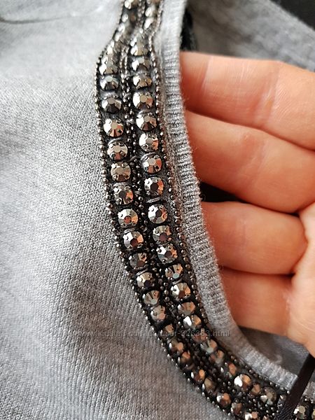 Представляю вязаный свитер Morgan в серых тонах, горловина которого украшена лентой из камней контрастного цвета, что позволяет использовать его как для повседневной носки так и для вечерних выходов.