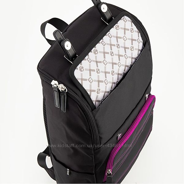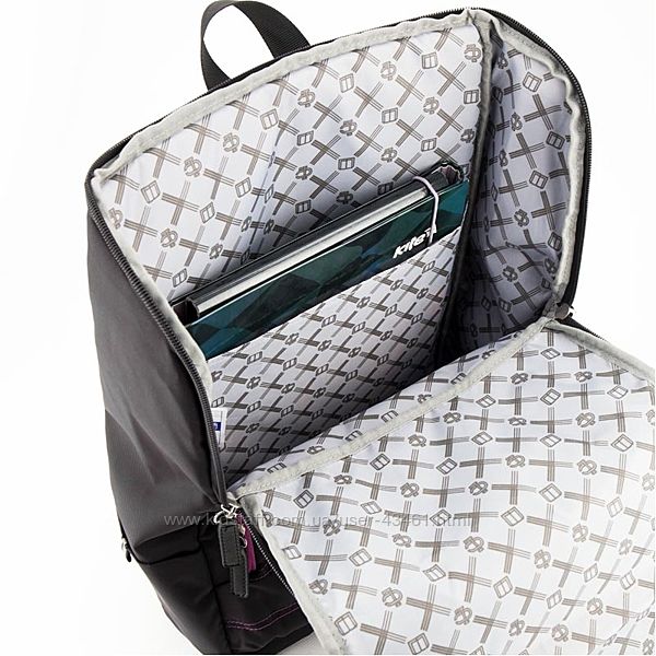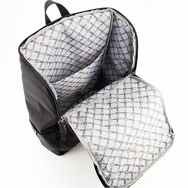 Рюкзак состоит из просторного отделения, внутреннего, 2 передних и 2 боковых карманов. Внутренний карман с легкостью вмещает ноутбук. Основное отделение закрывается выворотно с помощью 2 молний. Передний верхний карман фиксируется на скрытых магнитных кнопках.