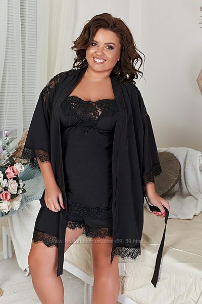 Халат свободного фасона на запах, пояс в комплекте, рукав 3/4. Шорты пояс на резинке, низ французкое кружево. Майка свободного фасона, подрез под грудью, брители регулируются, кружевной узор на груди. Ткань: супер софт + Гипюр. Цвет: Черный, Красный, Пудра. Размеры: 50-52, 54-56, 58-60, 62-64
