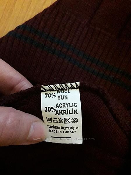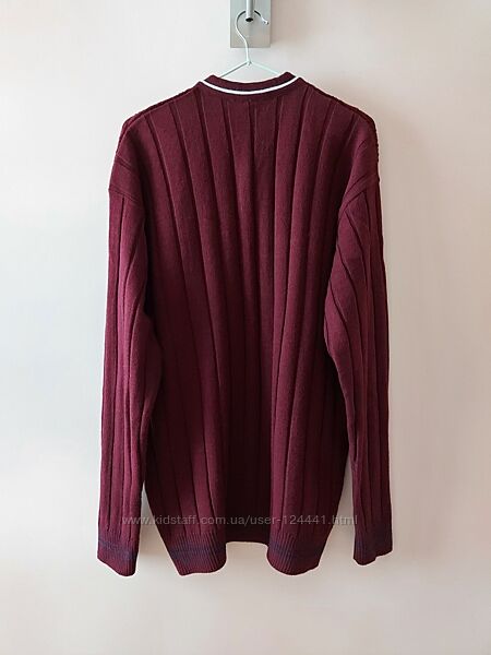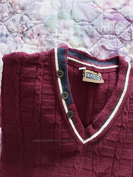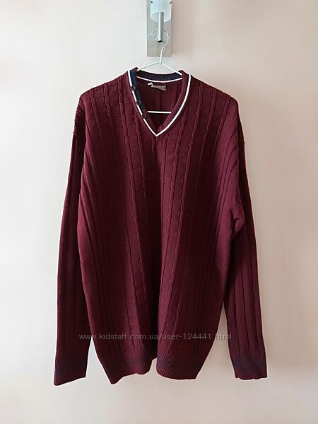 Свитер, пуловер Kameni красивого цвета бордо, производства Турция, качество отличное. 70% шерсти, 30% акрилик. Новый, без навесной бирки. Мягкий, не колючий. Красивая отделка горловины - разные цвета, декоративные пуговицы. Небольшой V-образный вырез, удобно одевать пуловер на рубашку. Размер указан 4, идет на L-XL - смотрите замеры. Длина - 75 ПО груди - 57 Плечо - 21 Рукав - 64 Все мерки тянутся.