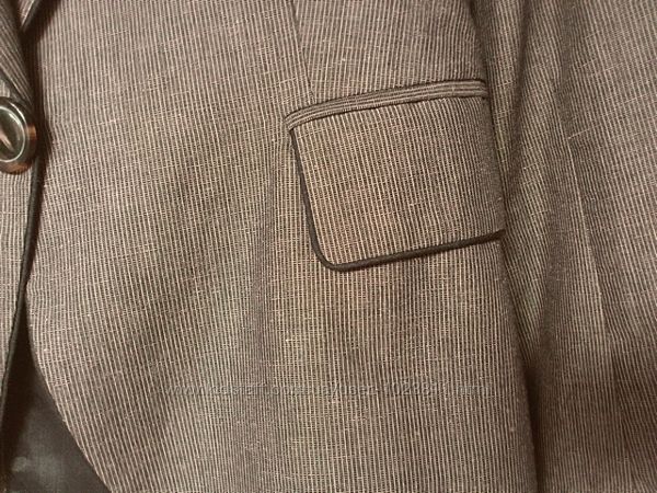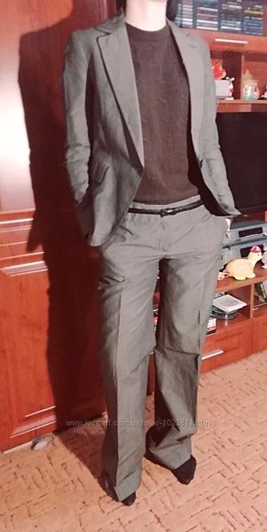 Жакет бренда Mango размер 38 (европейский),длина жакета-64см,полуобхват груди-45см,длина рукава -61 см,ширина плеч-38см, продается вместе с брюками Состав: 67% catton,33% linen подкладка 100% acetateЖенские классические брюки бренда Mango,размер 40,темно-коричневого цвета,полуобхват талии-45 см,полуобхват бедер-52 см,длина по внешнему шву вместе с поясом-109 см,длина по внутреннему шву-85 см.длина спереди от пояса до шагового шва-23,5 см,длина сзади от пояса до шагового шва-35см.