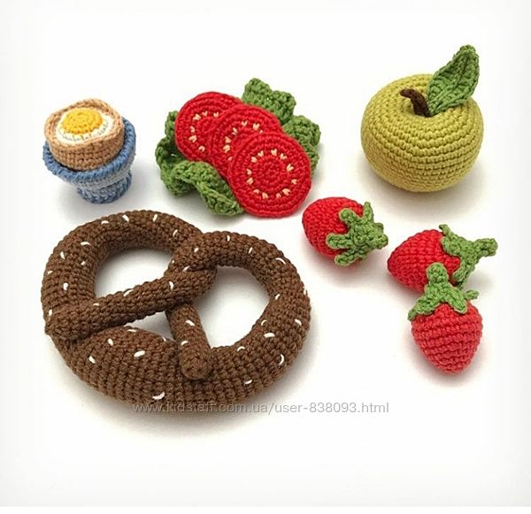 Вязаный игрушечный набор Завтрак!!Для развития и ролевых игр с ребенком , порадует и взрослого)Яйцо 70 грн, помидорки дольки 38 грн, клубнички 60, яблочко 90 грн, кренделек 90 грн, блинчик 50