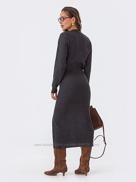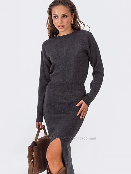 Демисезонный костюм мелкой вязки из высококачественного турецкого материала. Джемпер с круглой горловиной и длинными рукавами со спущенным плечом. Манжеты и низ связаны резинкой. Юбка-миди с эффектным разрезом сбоку. Талия выполнена резинкой.