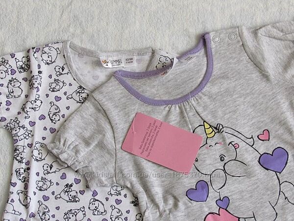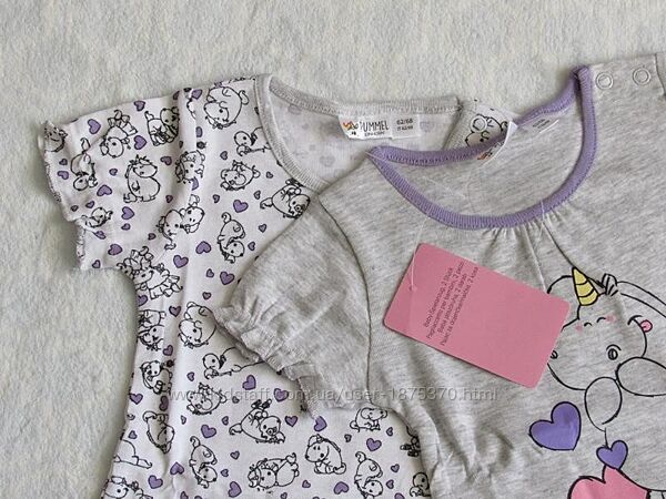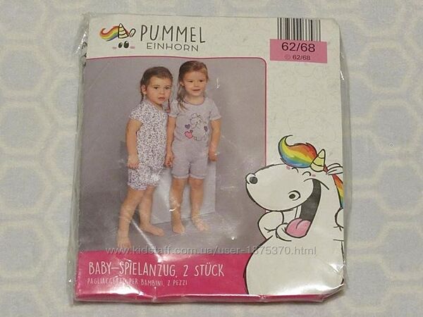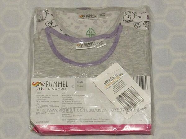 Комплект новых песочников (домашних костюмов) для девочки от фирмы Pummel единорог. Комплект состоит из 2 шт. Цена указана за комплект. На одном плечевом шве есть кнопочки для удобства одевания. Размер: 62/68 см Состав: 100% хлопок, серый 98% хлопок, 2% вискоза Длина изделия: 45,5 см ПОГ (по нижней части проймы): 25,5 см Длина изделия до кнопочек внизу: 40 см