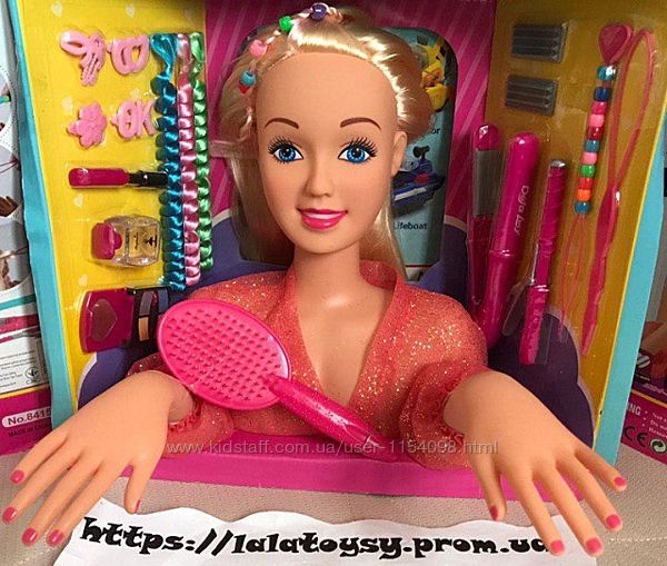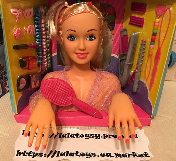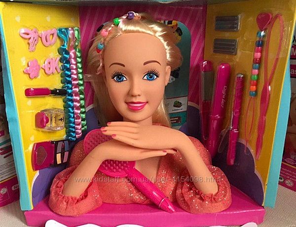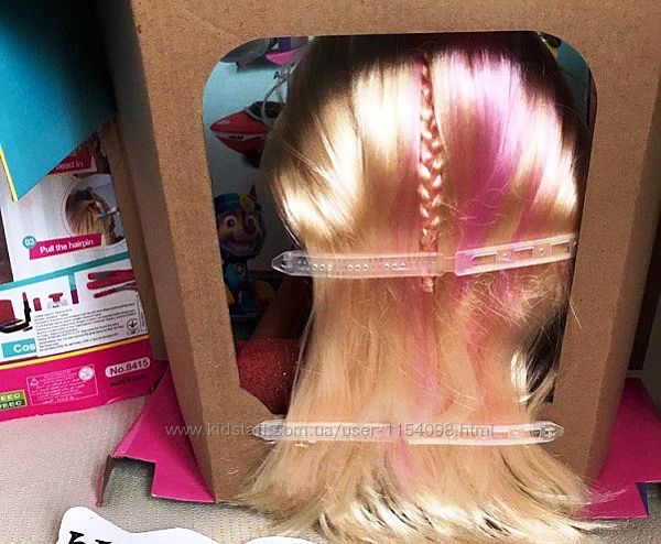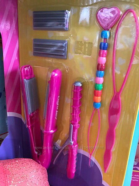 Также в комплекте идет расческа и косметика, плойка, заколочки, разноцветные пряди и т.д.