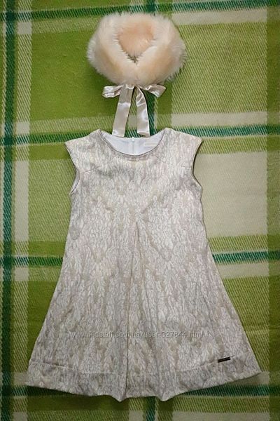 Платье в отличном состоянии! Одето раза 3 по случаю. Не на жару.верх- мягкий приятный трикотаж с золотой вышивкой, подкладка-хлопок.Украшено золотистой каймой из кожзама. К нему в наборе воротник из меха.Из нюансов-немножко потемнела металл. эмблема ( посл.фото).Размер 116, подойдет до 122 примерно, смотрите замеры.Покупала намного дороже, без торга!!! ПОГ-34длинна-64(от верха плеча)