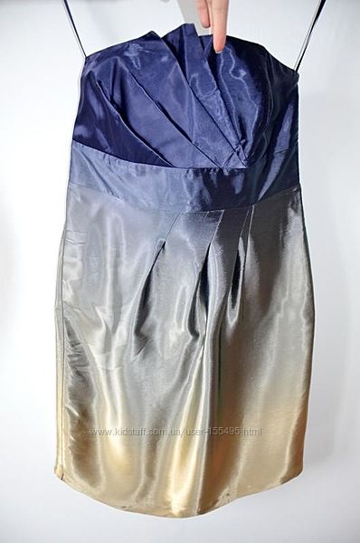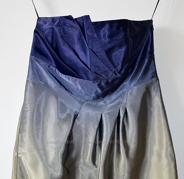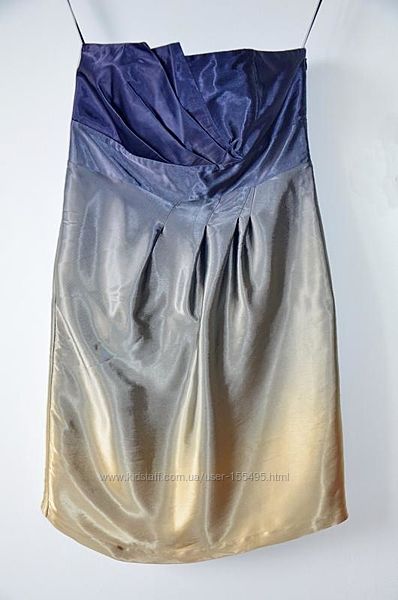 Нарядное шелковое платье цвета омбре (переход от одного цвета к другому). Платье на подкладке. Верхняя часть плотная , в швах косточки. Сбоку молния. Силуэт приталенный. Бюстье. Платье в идеальном состоянии. Одето два раза. Размер 12(L)ОГ - 92 см