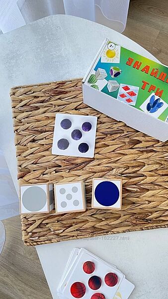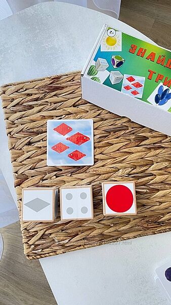Перед дитиною – картка з малюнком. Треба поставити всі три кубики у відповідне положення – якого кольору предмети на малюнку, якої форми, скільки їх? З’єднати докупи три ознаки – для цього потрібний неабиякий розвиток мислення, і в процесі гри ця навичка буде загострюватися.