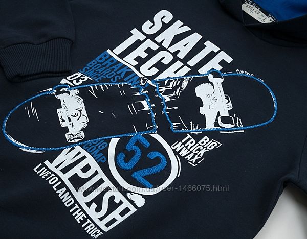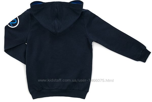 Каптур подвійний, на темно-синій трикотажній підкладці. Рукави прямі, вшивні, на манжетах. Низ худі та манжети рукавів оброблені м´якою подвійною трикотажною гумкою. Перед прикрашений стильним якісним принтовим малюнком з елементами вишивки та вишитою цифрою «52» на рукаві.