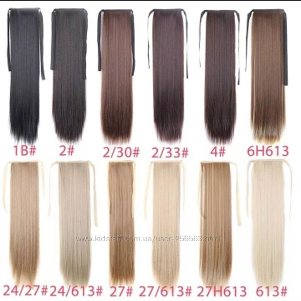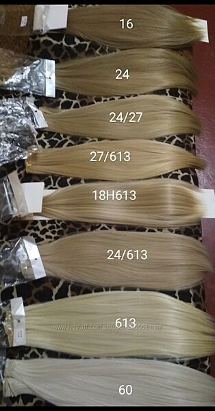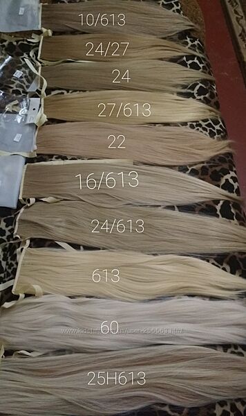 натуральный чёрный #1В ,#2 тёмный шоколад, #4 темний каштан, #8 коричневый тёмно русый 2/30, коричневый русый #6, коричневый светло-русый с рыжинкой #12, суперблонд #60, блонд #613, светло-песочный блонд #24/613, золотистый блонд #27/613, светло-русый блонд #24, золотисто-пшенійчний блонд #9, светло-русый блонд #18, #16. И другие.