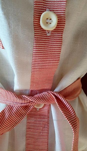 Прямой крой, есть пояс, застегивается на пуговицы, есть запасная пуговица, два нагрудных кармана, короткие рукава «реглан»