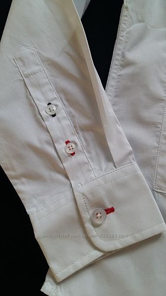 Классная белая рубашка с длинным рукавом из натурального хлопка. Актуальный слегка приталенный фасон, стильный крой, необычные мелкие акценты (красно-синие проймы для пуговиц, вышитая эмблема на спине, темная окантовка ворота).