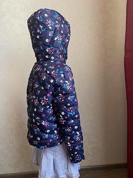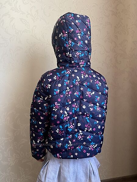 Теплая и легкая куртка с романтичным цветочным принтом. Практичный капюшон. Два кармана. Молния со вставкой для защиты подбородка.