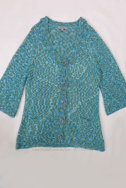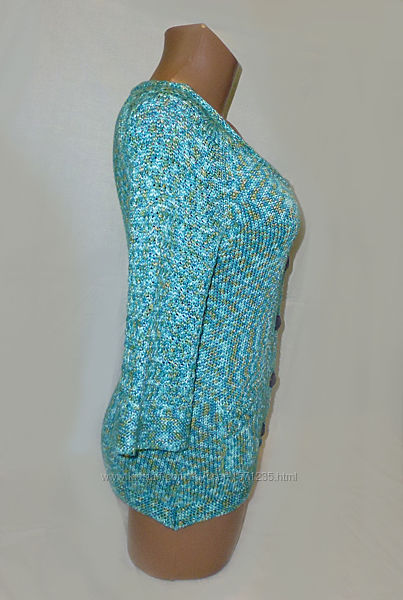 Кофта- реглан приятного бирюзового цвета от Per Una производства Турция. Размер- S.ПОГ- 36 см., длина 65 см., рукав 3\4- 22 см. (отподмышек). Состав: 62%- акрил; 38%- вискоза. Состояние хорошее.