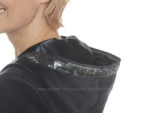 Кофта на молнии, карманы и капюшон декорированы пайетками.