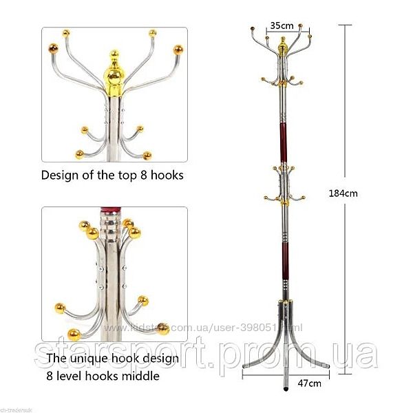 Напольная вешалка Coat Rack предназначена для бытового использования,для офиса или другого помещения,где есть необходимость хранить верхнюю одежду. Вешалка для одежды устойчивая в использовании, устанавливается в вертикальном положении на триногу.Вверху расположены восемь крючков для верхней одежды о головных уборов. По средине также имеется восемь крючков для хранения дамских сумочек,зонтов или детской одежды.
