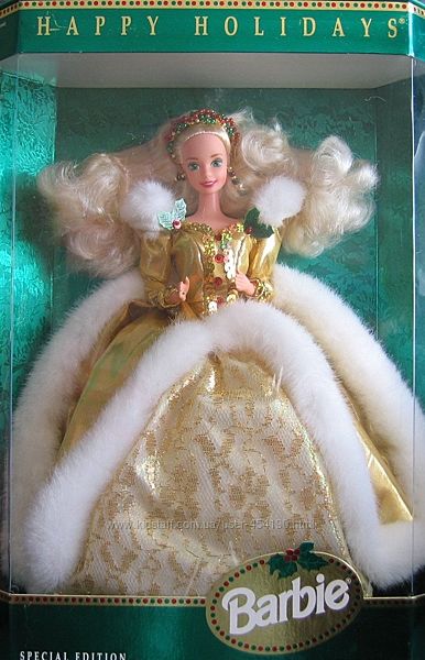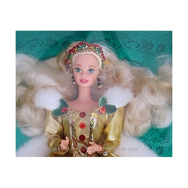 Кукла Барби Коллекционная Счастливого Рождества 1994 Barbie Happy HolidaysКукла Барби одета в праздничное зеленое платье с одета в гламурное золотое платье с отделкой из искусственного меха и белоснежной кружевной юбкой. Ее сказочный ансамбль акцентируется падубом и ягодами - он появляется на ее оголовье, сережках и даже подчеркивает золотое платье.