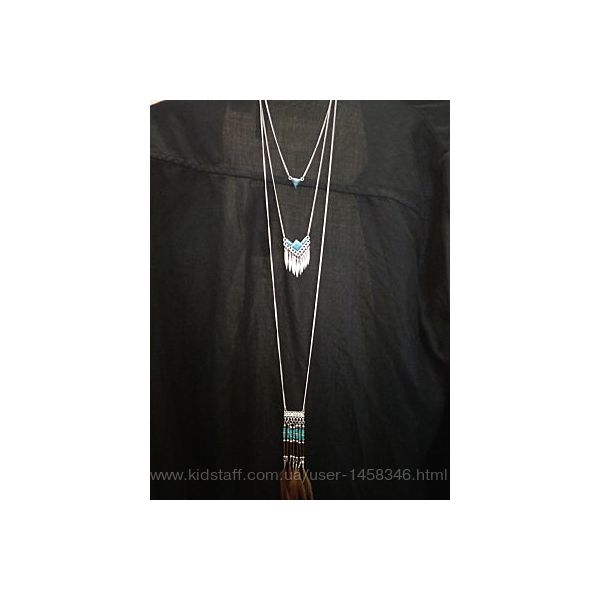 Красивый кулон "три в одном",три цепочки с бирюзой и перьями,выглядит очень неординарно и эффектно,в оригинале выглядит намного лучше,чем на фото. Длина цепочек: короткой 36 см,средней 48 см,длинной 80 см.длина цепочки для застежки 9см