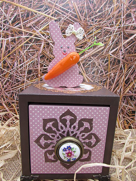 Оригинальная шкатулочка с зайчиком,декорирована в технике декупаж,вживления.Такая шкатулка будет отличным,оригинальным подарком на светлый праздник Пасха.