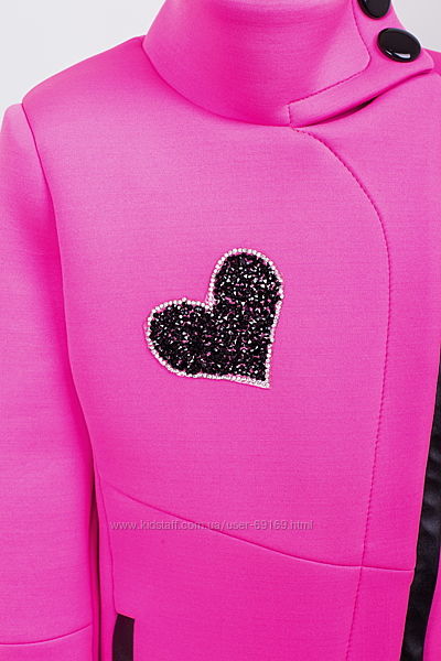 В таком стильном плаще юная модница обязательно будет в центре внимания. Модель объединила в себе сразу несколько актуальных тенденций: сочные весенние расцветки, модный декор, трендовую оригинальную застежку и популярную ткань неопрен. Слегка приталенный силуэт придает плащу женственность, а экстравагантная нашивка в виде сердца из страз вносит в образ романтичную нотку. Воротник-стойка застегивается на две пластиковые кнопки. Центральная застежка-молния расположена по диагонали, напоминая модную «косуху». Она декорирована планкой из кожвинила контрастного цвета. Также из коживинила выполнена отделка врезных боковых карманов и рукавов. Плащ не мнется, хорошо сохраняет цвет и форму. Изделие можно стирать в деликатном режиме (30ºС).