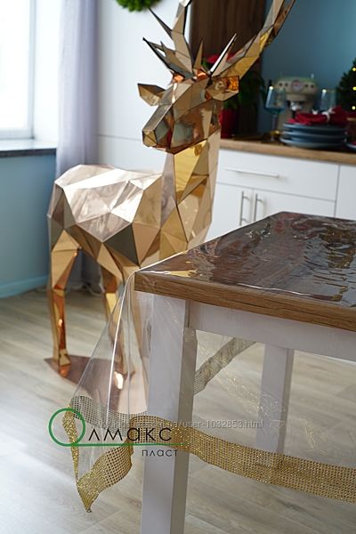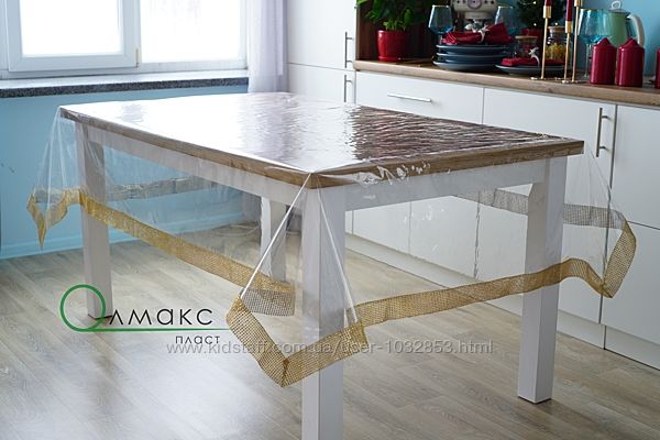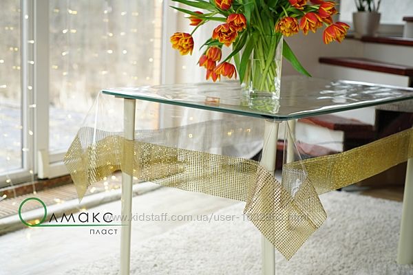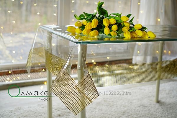 Это дизайнерская скатерть, пошита из прозрачного силикона и золотой стразовой каймы. Отлично сочетается с цветом дерева, подходит под любой интерьер. В отличии от обычной тканевой скатерти, она водо- и жиронепроницаема, ее не нужно стирать, достаточно протереть влажной салфеткой или тряпочкой.