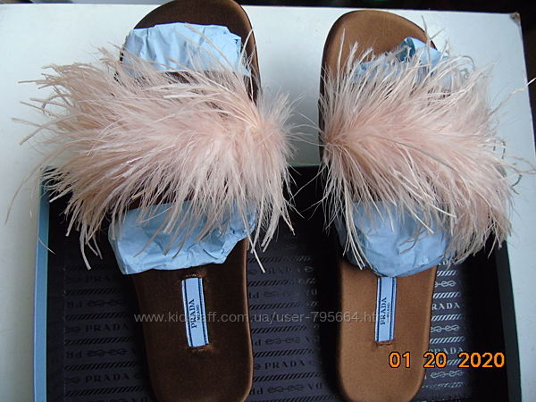 Продам коричневые пантолеты с каучуковой подошвой и широкой атласной перемычкой, украшенной бледно-розовыми перьями страуса.Сланцы с декором от Prada.