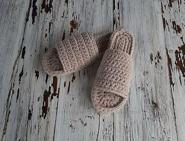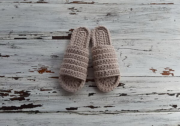 Тапочки из натуральной 100% хлопковой пряжи, очень плотные и удобные, имеют лёгкий массажный эффект. Ножки всегда в комфорте. Тапочки ручной работы, по-этому таких точно ни у кого не будет, это экслюзив который будет только у Вас. Можно стирать в машике на программе деликат, не отбеливать. Возможно исполнение в другом цвете и под Ваш размер, а также добавить украшение. Возврат товара не предусмотрен.
