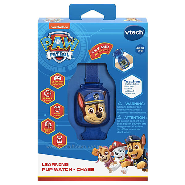 Наручний годинник від VTech PAW Patrol Chase Щенячий патруль ЧейзЦей годинник містить чотири ігри з прогресивними рівнями навчання, 12 настроюваних циферблатів годинника та вибір інструментів для вимірювання часу.