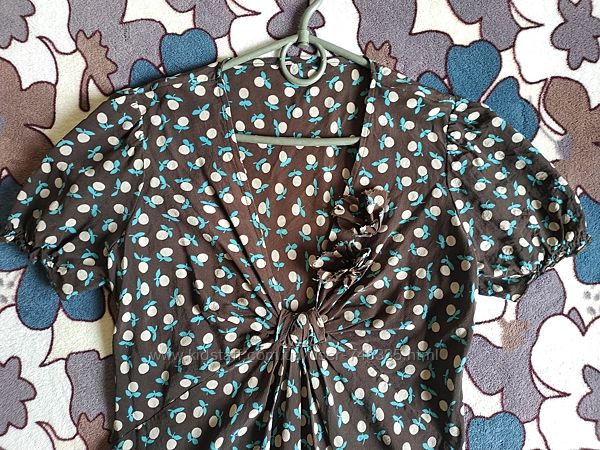 Блузка бренда Tara Jarmon, из 100% натурального шелка. Основной цвет - коричневый, узор из стилизованных яблочек. На груди - два пришитых цветка. Состояние идеальное, носилась один раз, продажа из-за смены размера. Размер S-M, замеры: между подмышками - 47 см, длина по спинке - 57 см. Замеры девушки на фото: грудь 95, талия 72, бёдра 101, рост 164.