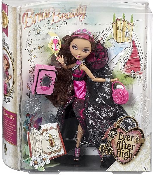Кукла Эвер Афтер Хай Браер Бьюти очень нарядная и красивая! В комплект с куколкой входят разные вещички, которые помогут создать девочке сказочное настроение и создавать удивительные истории со своей героиней! Кукла Браер Эвер Афтер одета в симпатичное платье нежно розового цвета, на котором изображены розы и шипы. В тон к платью, на плечах у куклы накинут прозрачный плащ с узорами. В руках Браер Бьюти несет свою сумочку, а ее запястье украшает браслет. На пальце одето красивое кольцо, а в волосах сверкает серебряная диадема. Изюминкой серии является книга легенд и ключик к ней, благодаря которому можно открыть книжку и свершить свою судьбу одним взмахом пера и чернила!