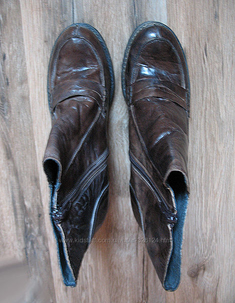 Очень необычные и достаточно стильные ботиночки из кожи сложного приглушенно-коричнево-оливкового оттенка с едва уловимым полированным блеском.Куплены дорого лет 7 назад в «Глобусе» на Крещатике.