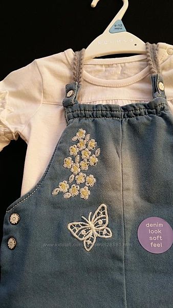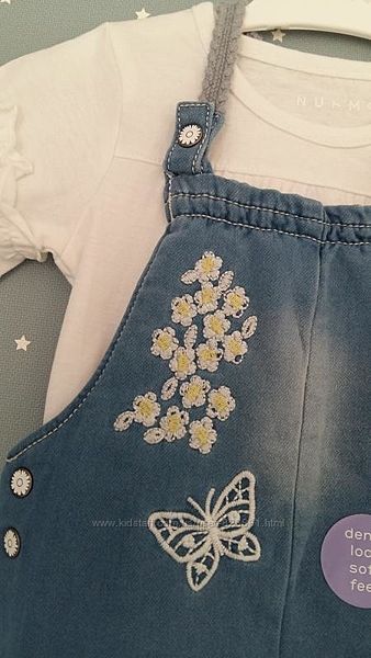Комбинезон выполнен из мягенького денима, декорирован вышивкой в виде бабочек и цветов.