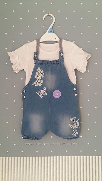 Классный качественный комплект-двоечка для маленьких принцесс: футболочка и джинсовый комбинезон.Футболочка белая, из натурального хлопка. Рукавчики с небольшими оборками.
