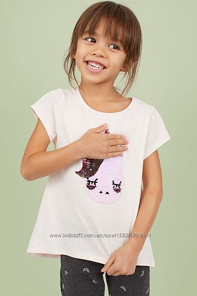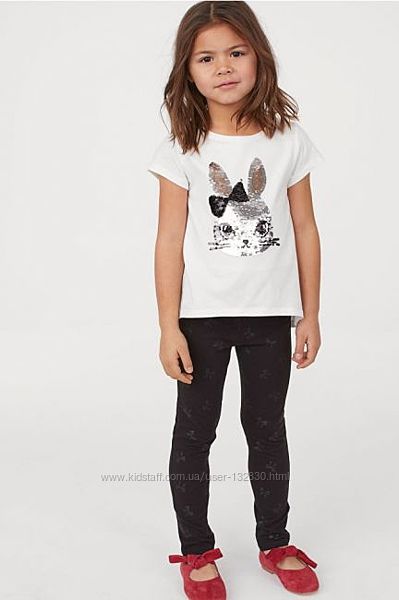 В наличии яркие орининальные комплекты H&M для девочек.Комплект состоит из футболки ,украшенной аппликацией из ревресных пайеток,и штанишек-треггинсов.