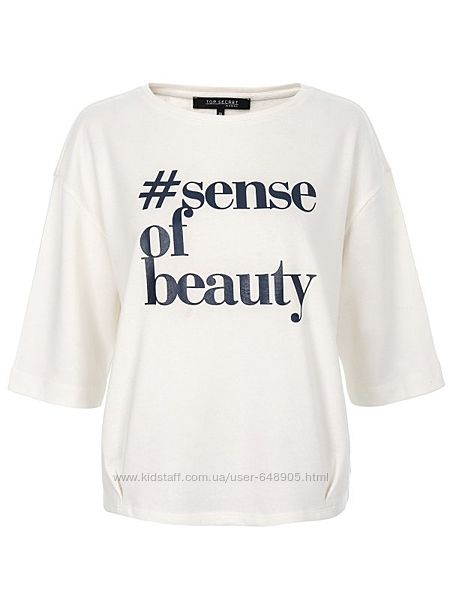 Белая толстовка с 3/4 рукавом и контрастным принтом спереди в виде надписи SENSE OF BEAUTY от Top Secret. Модель фасона oversize, удобная и актуальная. Новая с биркой.*