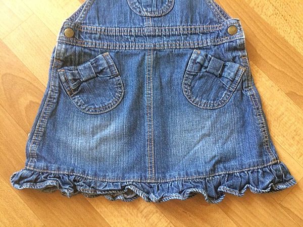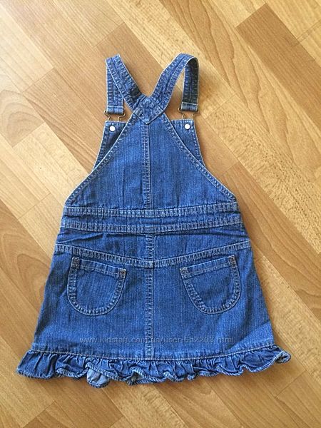Джинсовый сарафан George в идеальном состоянии, как новый. Украшен симпатичными накладными кармашками с бантиками. По бокам застегивается на кнопки. Цвет темно-синий.Размер 104-110 ,4-5 лет