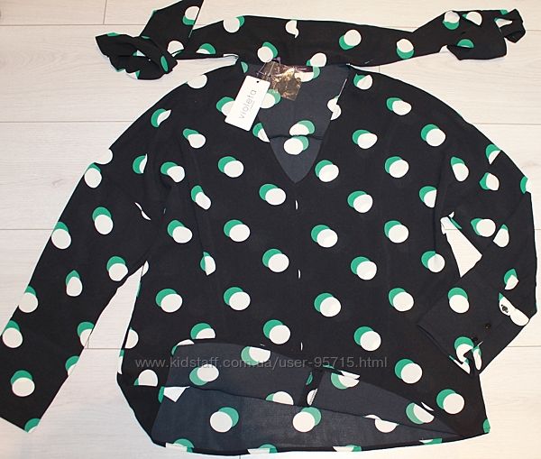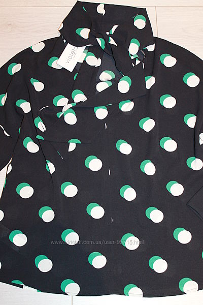 ОПИСАНИЕ Струящаяся ткань. Принт в горошек. V-образный вырез горловины. На шее завязки. Длинные рукава.СОСТАВ - 97% полиэстер, 3% эластан