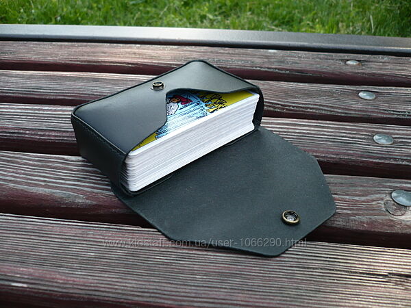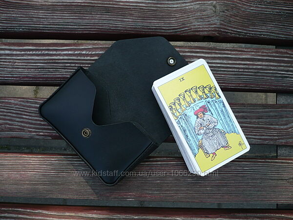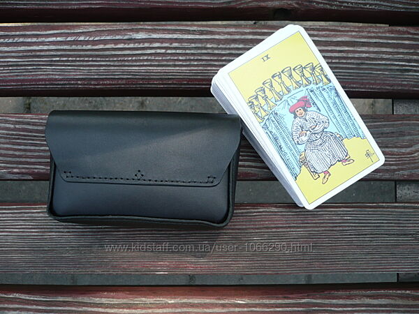 Кожаный чехол для карт таро. Кожа растительного дубления с матовой лицевой поверхностью производства Италии, цвет черный. Чехол прошит вощеной нитью, урезы обработаны средством tokonole (Япония). Финишное покрытие - крем kenda farben grease mat ( Италия )Размер: 130*75*40 мм ( под колоду размером 120*70*35 мм). Кнопка украшена декоративным кончо из греческой монты. Ручная работа. Ценность: 600 грн.