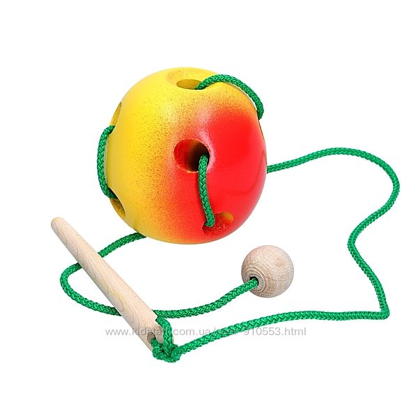 Шнуровка в виде яблока с отверстиями. Иголочка из дерева в виде червячка должна прогрызть насквозь яблоко. Игрушка - шнуровка предназначена для развития ребенка . Шнуровка улучшает сенсомоторную координацию движений, совершенствует координацию системы «глаз-рука», гибкость кисти, глазомер, цветовосприятие, усидчивость, концентрацию внимания. Шнуровка поможет подготовить ручку ребенка к письму, способствует развитию речи.Рекомендовано для детей от 1,5 лет.