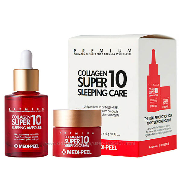 ЕХР 04.2026Набір Medi-Peel Collagen Super 10 Sleeping Care - це чудовий засіб для антивікового нічного догляду. Набір зволожує, помякшує і розгладжує шкіру, підвищує еластичність і пружність, зменшує видимість зморщок і надає здорового сяйва.