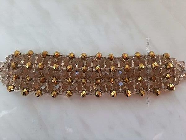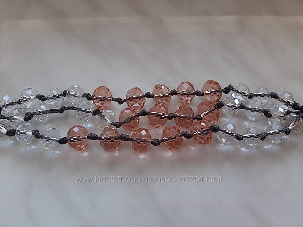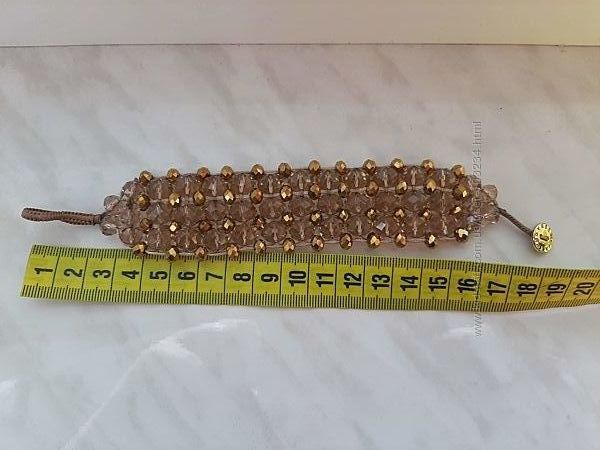 Новый,только без бирок!Стильный эффектный браслет, выполненный из трёх зафиксированных между собой нитей великолепных бусин богемского стекла. Браслет выполнен на тканевой основе (макраме) и застегивается на декоративную металлическую пуговицу. Длина украшения 18 см