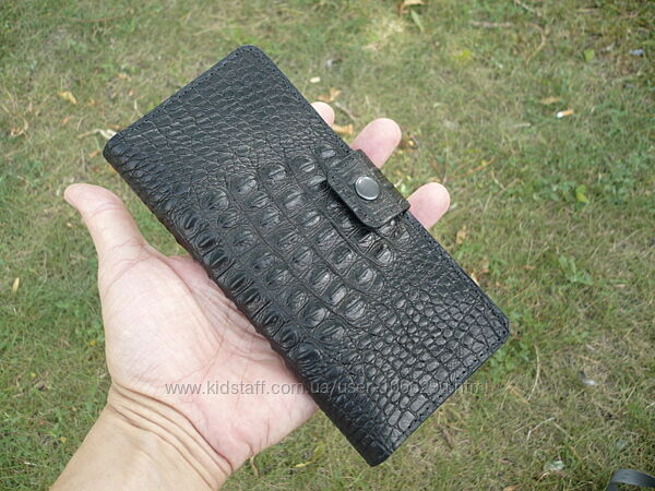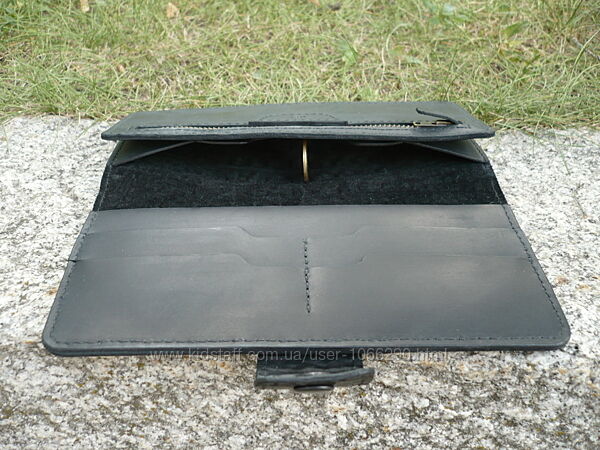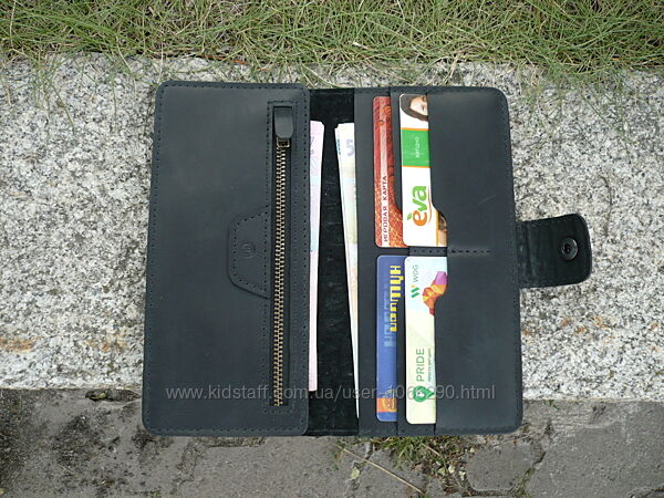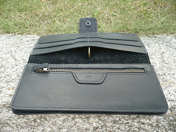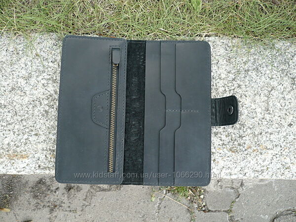 Портмоне из комбинированной кожи черного цвета. Внешняя часть: кожа КРС с тиснением "Беби крокодил" производство Турции, внутренняя часть: кожа КРС "crazy horse" производство Украины. Три отделения (1 на молнии, молния YKK Япония), 5 карманов для карточек. Прошита вощеной нитью 0,45 мм. Урез обработан и отполирован. Размер 95*190 мм. Ручная работа. Ценность: 1000 грн.