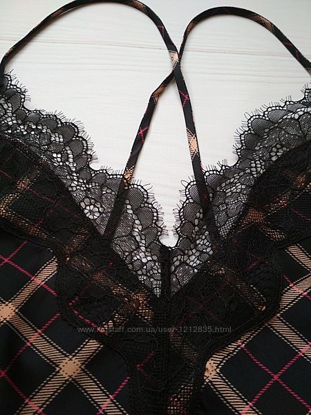 Шикарная ночнушка Asimmetrical Plaid & Lace Slip от Victoria´s Secret.Гладкая, шелковистая ткань и красивое нежное кружево. Тонкие регулируемые бретели, перекрещенные на спине.