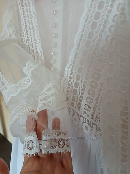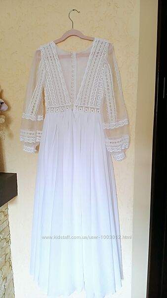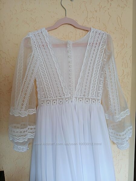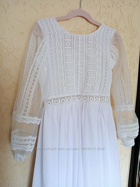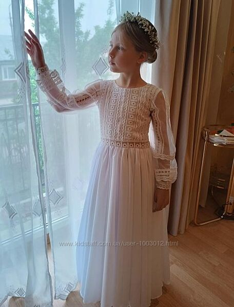 Біле плаття сукня на перше причастя розмір 134-140 Стан ідеальний. Чисте. Дуже гарне і ніжне. Спідниця з підкладкою із бавовни. Довжина від плеча до землі 110 см, довжина спідниці 80 см, довжина до пояса 30 см, рукав від плеча 47 см, ширина в поясі 29 см.