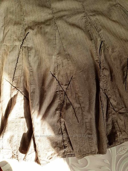 Летняя хлопковая юбочка Per Una от Marks &Spencer из Англии .Юбочка очень элегантная , в тонкую сероватую полосочку с люрексом , красиво выполнен переход омбре сверху светлее к низу коричневато-серый. Очень стройнит благодаря такому сочетанию. Фасон годэ, вверх животик как бы утягивает от бедер мягкое расширение ниспадание . Женственный фасон. Еще изюминка геометричноо расчитый подол паетками в тон .