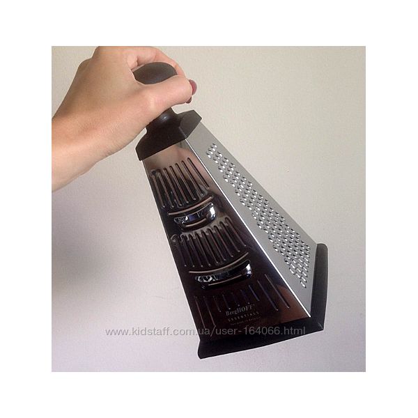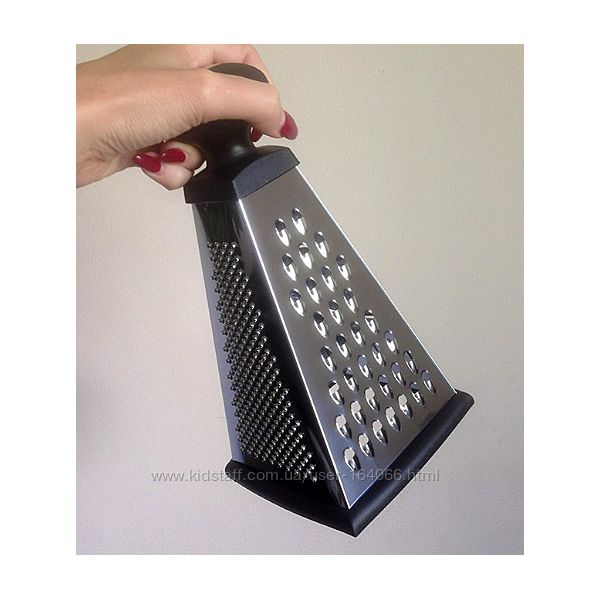 Терка – это необходимый предмет на любой кухне. Изготовлена она из высококачественной пищевой нержавеющей стали, материала прочного, не подверженного коррозии на протяжении длительного периода времени, так что послужит вам достаточно долго.Имеет форму пирамиды, – у нее удобная высота и угол наклона, который защищает руки от порезов. С каждой стороны терки расположены острые лезвия, разные по размеру: крупное, среднее и мелкое ( для сыра, овощей, мускатного ореха, цедры и пр.), а также специальное лезвие для нарезания ломтиками, их можно использовать для приготовления картофельных чипсов, фигурной нарезки огурцов и пр.