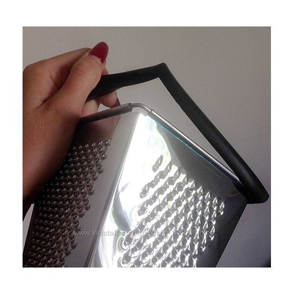 У терки удобная ручка из пластика. Основание, благодаря силиконовой подложке, имеет отличную фиксацию, и не скользит по рабочей поверхности стола. Такая терка не требует особого ухода, ее можно мыть в посудомоечной машине.